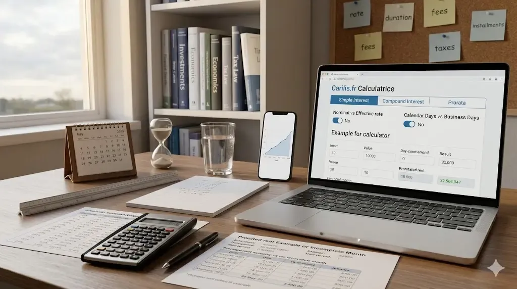 Vous cherchez à calculer rapidement des intérêts ou un prorata de loyer ? Carilis.fr met à votre disposition des pages pratiques qui combinent formule, explication claire et exemple chiffré — tout ce qu’il faut pour obtenir un résultat fiable sans Excel ni logiciel spécialisé.