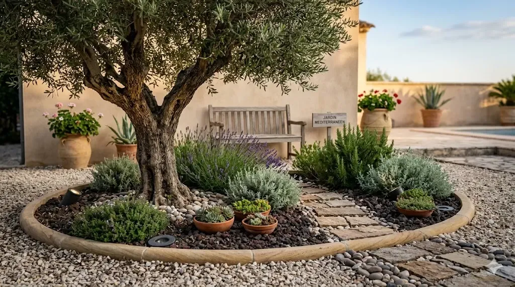 L’olivier se décore avec quelques gestes simples : un paillage minéral bien choisi, deux ou trois plantes compagnes et une bordure nette suffisent à transformer son pied en véritable point focal de jardin.