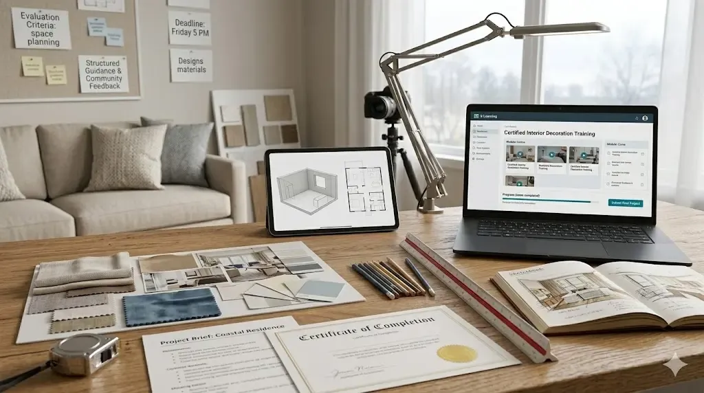 La promesse centrale de la formation certifiante est claire : devenir décorateur ou décoratrice d’intérieur opérationnel(le), capable de travailler en indépendant ou en agence, avec des outils, des livrables et une certification pour le prouver. L’approche se distingue volontairement des tutoriels gratuits disponibles sur YouTube ou Pinterest : il s’agit ici d’un parcours structuré, progressif, avec des retours personnalisés et une logique de montée en compétences orientée vers le terrain.