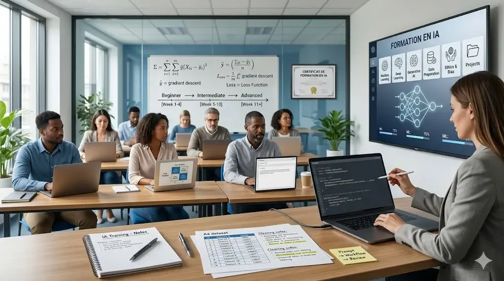 Une formation en intelligence artificielle est un parcours structuré qui vous permet de comprendre, d’utiliser et parfois de concevoir des systèmes capables d’automatiser des tâches, d’analyser des données et de générer du contenu ou des prédictions. Elle couvre un spectre large : de la simple initiation aux outils d’IA générative jusqu’aux architectures complexes de machine learning et de deep learning.